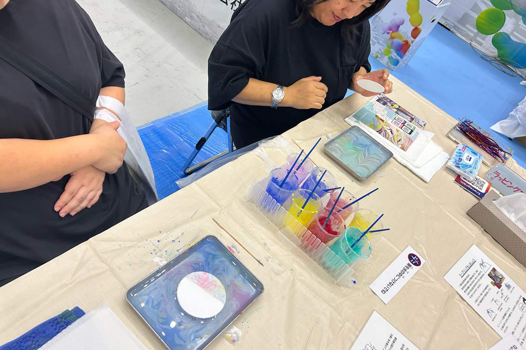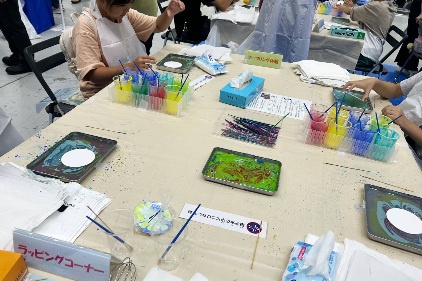 日信化学工業株式会社様が、創立70周年という節目のブランディングにおいてマーブリングを採用されていたことをきっかけに、2025年9月19日(金)・20日(土)の2日間、越前モノづくりフェスタにて、同社ブース内でマーブリングワークショップを実施しました。